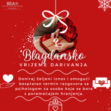 Svojom donacijom omogućite besplatnu psihološku pomoć osobama oboljelima od anoreksije, bulimije i nespecifičnog poremećaja hranjenja! Ove godine naša Božićna donacija usmjerena je na veljaču, Svjetski mjesec skretanja pažnje na poremećaje hranjenja. Želimo sakupiti dovoljno sredstava za besplatne ulazne razgovore za naše korisnice/korisnike tijekom cijele veljače!