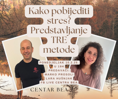 Kako bismo vas upoznali sa zanimljivom metodom opuštanja Tension-Trauma Releasing Exercises, najavljujemo predavanje pod nazivom "Kako pobijediti stres? Predstavljanje TRE metode" koji će se održati u ponedjeljak 10.2.2025 u 19 h na FB live Centra BEA.