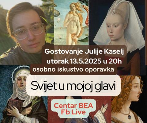Svaka od oboljelih osoba piše svoju osobnu priču izlaska iz poremećaja hranjenja. Želite li poslušati iskustvo osobnog putovanja i oporavka od anoreksije i bulimije, uključite se u zanimljivo gostovanje Julije Kaselj. Predavanje u formi razgovora pod nazivom "Svijet u mojoj glavi" održat će se u utorak 13.5.2025.u 20h na Fb Live Centra BEA, a kasnije će biti dostupno i na YouTube kanalu Centra BEA.