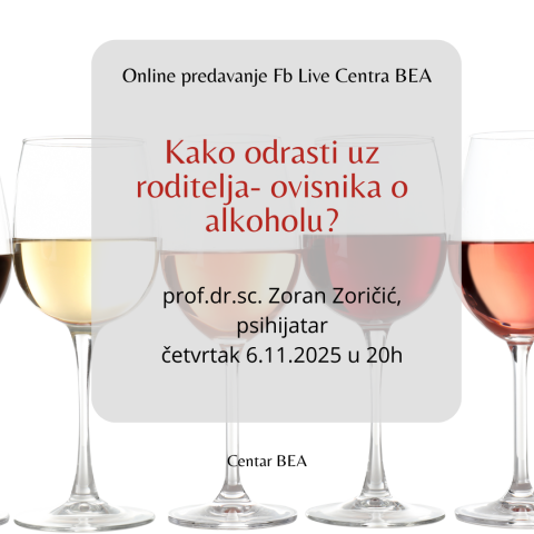 Želite li saznati više o tome kako alkoholizam utječe na obiteljsku dinamiku i koje posljedice ima na mentalno zdravlje djece, poslušajte predavanje prof.dr.sc. Zorana Zoričića, psihijatra i psihoterapeuta pod nazivom „Kako odrasti uz roditelja- ovisnika o alkoholu?“ koje će se održati u četvrtak 6.11.2025.u 20 h na Fb Live Centra BEA.