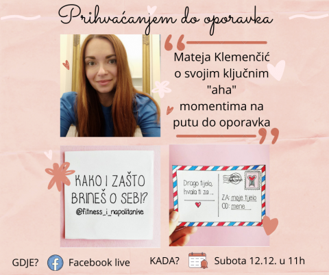 Pozivamo vas na online predavanje "Prihvaćanjem do oporavka" koje će se održati na fb Centra BEA u subotu 12.12.u 11 h. Predavačica je Mateja Klemenčić, mlada žena sa iskustvom poremećaja hranjenja. Mateja je i autorica vrlo praćenog IG profila https://www.instagram.com/fitness_i_napolitanke/ koji na kreativan, nježan i inspirativan način promovira pozitivan odnos prema vlastitom tijelu.