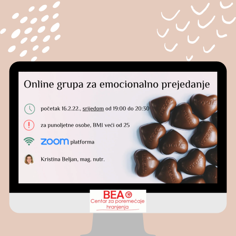 Blagdani su već daleko iza nas, a mnoge novogodišnje dijete su već isprobane. Budući da svaka dijeta može dovesti do narušenog odnosa prema hrani, vrlo lako se može ući u začarani krug prejedanja i krivnje. Pozivamo Vas da se uključite u online grupu za emocionalno prejedanje u Centru BEA pod vodstvom nutricionistice Kristine Beljan. Grupa traje 20 tjedana (20 susreta) i provodi se u 3 ciklusa: