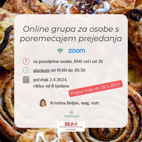 (osobe s BMI manjim od 26 mogu se uključiti u online grupu namijenjenu oboljelima od anoreksije, bulimije i nespecifičnog poremećaja hranjenja pod vodstvom mag.nutr. Jelene Zubić, također u Centru BEA).