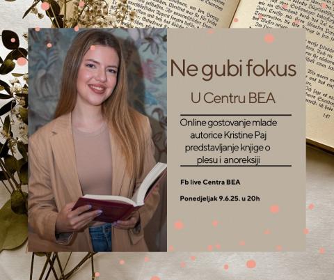 Što potakne djevojku da u ranim dvadesetim godinama napiše knjigu u koju uključi i osjetljivu temu poremećaja hranjenja? Kakve veze imaju anoreksija i ples? Jesu li iskustva opisana u knjizi „Ne gubi fokus“ autobiografska ili izmišljena? Na ta i još mnoga pitanja saznajte odgovor na gostovanju mlade književnice Kristine Paj u Centru BEA. Razgovor će se prenositi putem Fb Live a održat će se u ponedjeljak 9.6.u 20h.